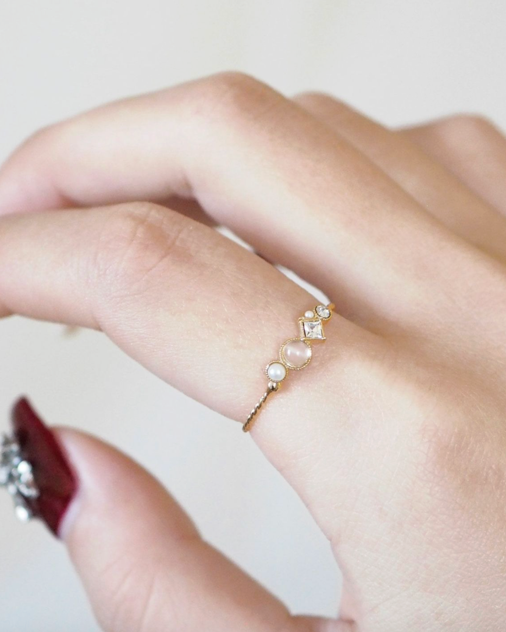 "MUK Dreamy Stone" is a charm accessory series that embodies the good fortune of natural stones. This ring features a heart-shaped design with crushed natural stones tightly embedded inside. The gentle colors of the natural stones and the small heart motif are framed with metal, making it not too sweet, making it a recommended item for adults who want to enjoy a subtle heart motif.